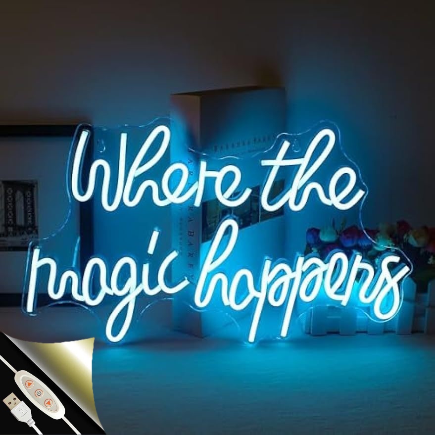 「Where The Magic Happens」LED ネオン看板は、アイスブルーの柔らかい光を放ち、ベッドルーム、サロン、結婚式、誕生日パーティー、バー、マンケーブなどにぴったりのデコレーションアイテムです。美しいフォントとロマンチックなピンク色の組み合わせが、夜間に温かくロマンチックな雰囲気を作り出します。