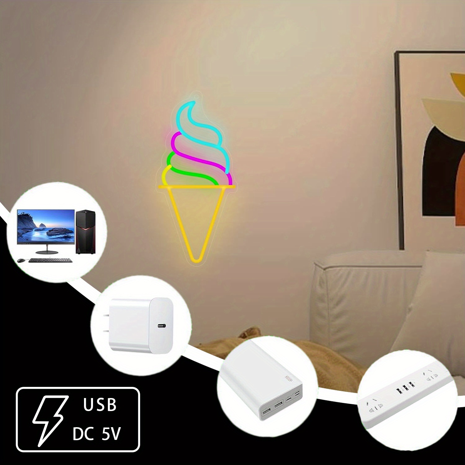 このアイスクリームネオン看板は、店舗やパーティー、バー、寝室にぴったりの装飾アイテムです。USB電源で簡単に接続でき、5色のビビッドなライトで部屋を鮮やかに照らします。調光機能があり、明るさを自由に調整できます。店舗やビジネスに活気を与え、家では楽しい雰囲気を演出します。